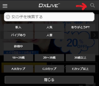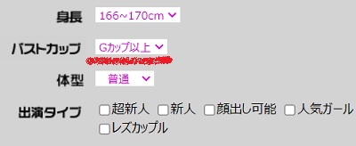 スマホをお使いなら、トップページの虫眼鏡マークから”Eカップ以上”を選択すれば、おっぱいの大きい女の子を探せます。EやFカップも表示されてしまいますが、G・H・Iカップなど女の子も多いので割とすぐ見つかります。